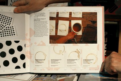 I fell in love with this book at Borders. It has all sorts of clever handmade-ish and creative invitations, greeting cards and business cards. I came straight home and added it to my Amazon wish list. I loved these moving cards. The company was moving to the “Tea Building” so after the information was letterpressed they went through and put a tea stain on every single card.