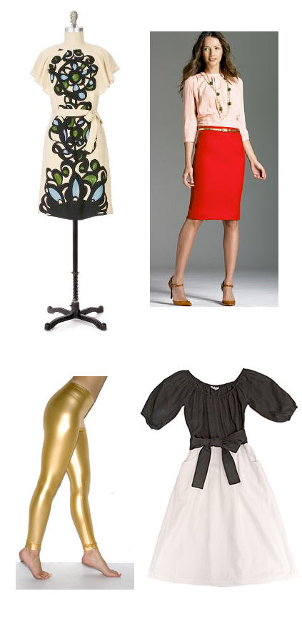 A. Printing Press Sheath B. Pencil Skirt and Top C. Gold Lame Leggings* D. Two Tone Dress