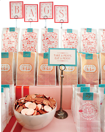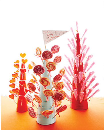 I’m super inspired by the details at Cheree Berry’s wedding in Martha Stewart. I love these spraypainted foam balls, the brightly printed favor bags (reminds me of these), and this lollipop stand (instructions to make this right here.)