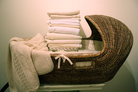 (This is our bassinet from a French flea market, plus I love newborn babies all wrapped up in clean neutral colors.)