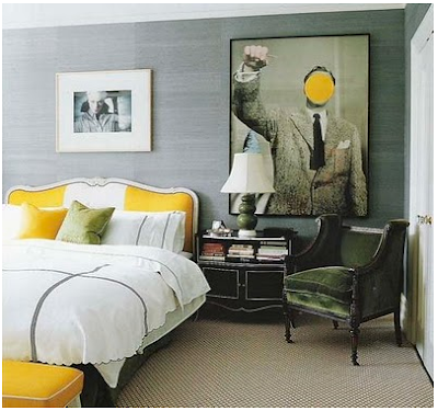 I love that she used gray as the backdrop in almost every room and then just added punches of yellow, green and strong black lines (art, stripes, etc)
