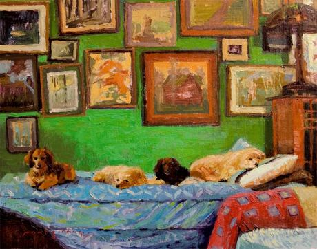 I like how the paintings on the wall look more like his usual style paintings; as though this tells a story of a collector of his work and their life. It's great!