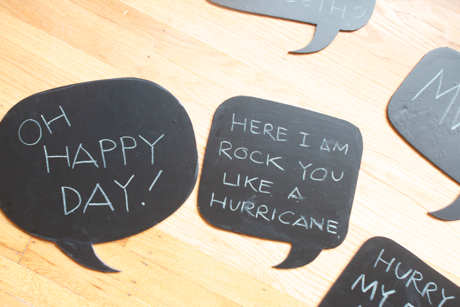 Here is another idea we did for the Kirtsy Party at Blogher. The theme was “Voices of the Year” so the whole party was branded with talk bubbles. For the photobooth of course we did chalkboard talk bubbles that people could write in themselves and then get their picture taken. My sister Gabrielle, gets the credit for figuring out how to make them out of something other than wood. Here is the step by step for how we did it for about $12.