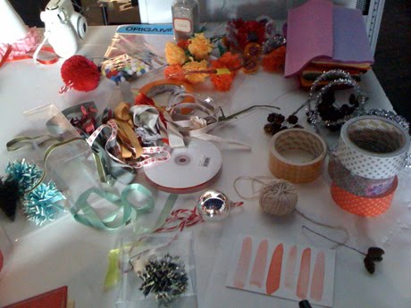 First I met with Suzanne Shade, the art director and she discussed the layout and what they were looking for. Then I went to work collecting all sorts of goodies from my supply closet. (It feels so good to actually use all those pretty things I bought for no reason!) I also stopped by the Ribbonrie and Fantastico to buy ribbons and knickknacks for styling. Here is a picture of a small part of the props I brought.